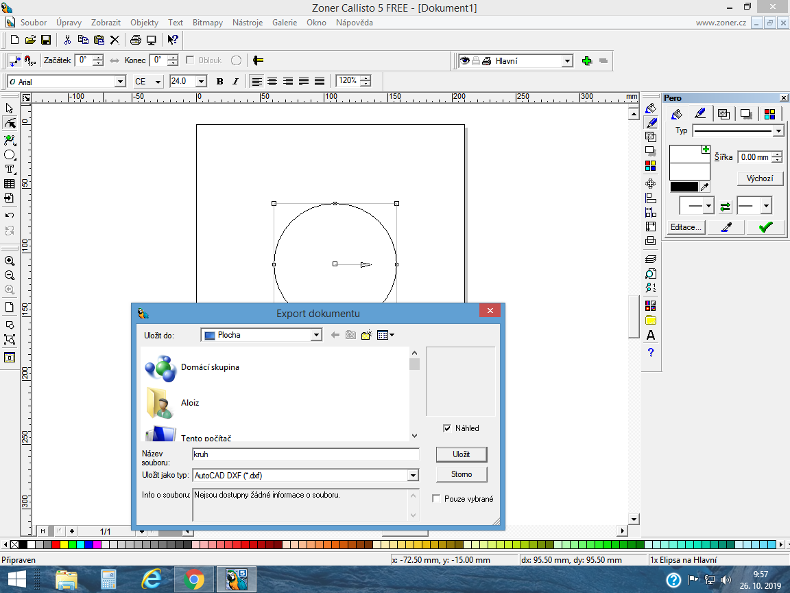 Nakreslím vektorově např kruh který má 4 uzlové body a dám Export uložit kruh jako DXF.