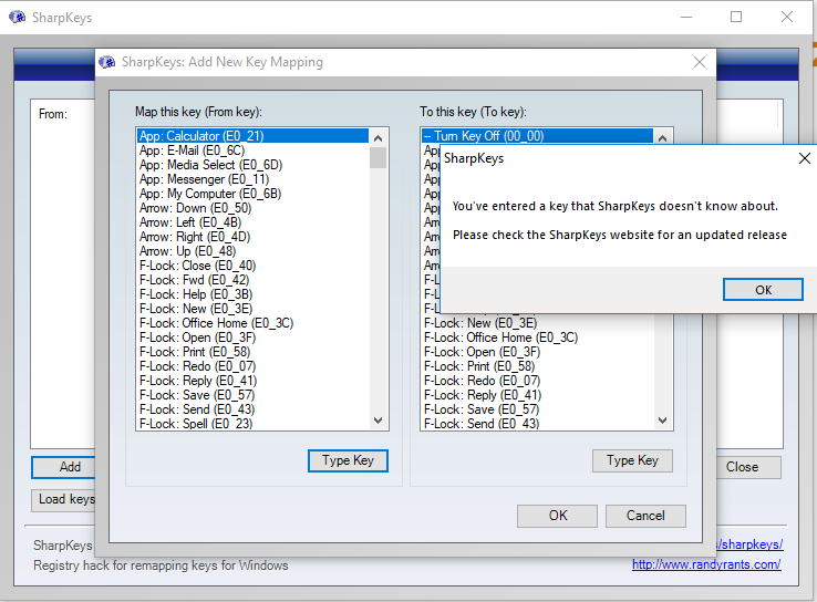 Vyhodilo to kod 00_100, coz podle informaci tady defacto znamena, ze sharpkeys tu klavesu nezna.