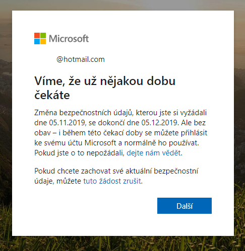To já ho neztratila. Maily mi chodí v pořádku a číslo jsem si dala novy. Jen se mi ta politika Microsoftu nějak vůbec nelíbí. Všichni ostatní to mají tak, že se bezpečnostní prvky mění okamžitě. Nechápu ten smysl toho, že se musí čekat měsíc. Naco? Proč? Prostě toto mi hlava nebere.