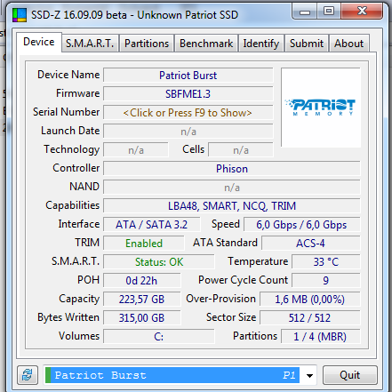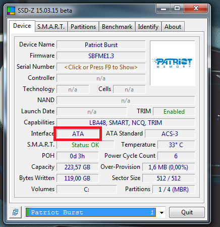 Pro ověření rychlosti disku jsem si stáhl programy a zdá se mi že rychlost není taková jakou mají ostatní lidi např: youtube testech nebo recenzi tohoto disku, kde se rychlost čteni a zápisu pohybuje kolem 400-500mb/s, u mě je to max 320mb/s. V programu SSD-Z v položce Interface mám ATA , zatím co jsem u ostatních lidi s tímto diskem jsem viděl SATA (možná to bude problém - nevím )