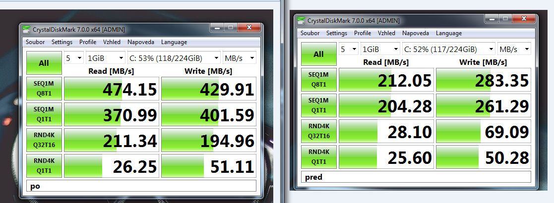 Ano to máte pravdu, já taky nečekám zázraky za tu cenu, ale jen to přirovnávám s ostatními, kteří mají úplně stejný disk a naměří pomalu jednou tolik, to je vše proč to řeším :-) a tak hledám příčinu, kde sem mohl udělat chybu. Zatím nevím.