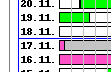 Ja to mam udelane tak, ze se mi ukazuje cely mesic, s datumy u radku, mezi nedeli a pondelim je dvojita cara, jinak jednoduche, sloupce odpovidaji hodinam, silneji vytazene 6,12, 18, jinou barvou vytazene obvykle zacatky a konce (dle potreby), udalosti zobrazene jako barevna policka (pod tou mrizkou, s rozlisenim na 5 minut), barva odpovida typu udalosti (typy tvori strom, obarvim-li uzel, jsou stejne obarveny i vsechny pod nim, pokud jim nanastavim vlastni barvu). Kliknutim nekam se zobrazi detaily udalosti, na kterou jsem kliknul - pokud chces tech udalosti hodne, takze budou fakt male, tak muzes zobrazit treba i nekolik pred a za.