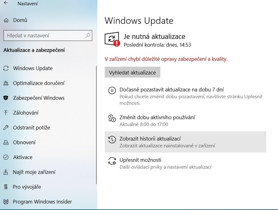 win 10 vypisují, že chybí aktualizace