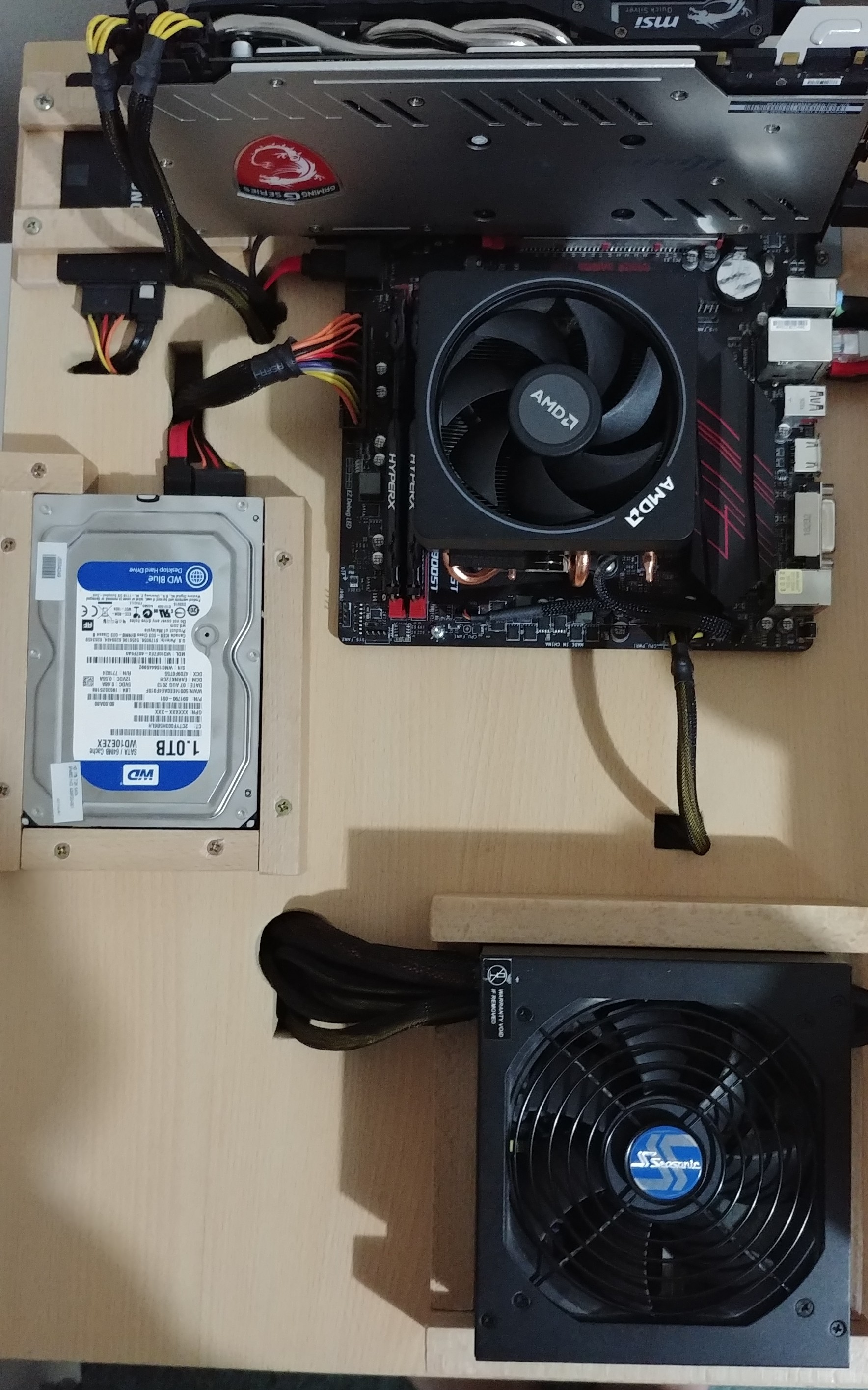 Pokud uz takhle, tak bych hlavne dal grafiku "na placato"a propojil s deskou flex riserem - ne aby z toho trcela kolmo ven. Tim to cele posunes dolu, zdroj das dole vlevo, hotovo. Osobne se mi nelibi to drevo, umim si predstavit nejakou povrchovou upravu - matna tmave seda barva treba...