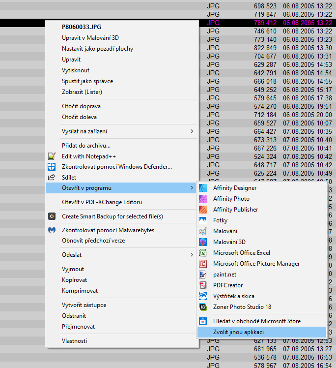 Standardní postup: Klik na soubor pravým tlačítkem -> najetí na Otevřít v programu (není třeba klikat) -> klik na aplikaci