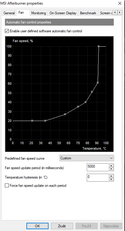 Dobré odpoledne všem mám dotaz,ohledně MSI afterburneru. Chtěl bych radu jak dobře nastavit vlastní křivku chlazení? Při hraní Dying Light se teplota grafiky pohybuje kolem 40 stupňů Celsia při 65% fan speed. Zdá se mi že je to trochu moc na tak malou teplotu. Jak to máte nastaveno vy? Grafickou kartu mám MSI GTX 1070 Gaming X. V nastavení mám taky zaškrtnuto "Enable user defined automatic fan control'.