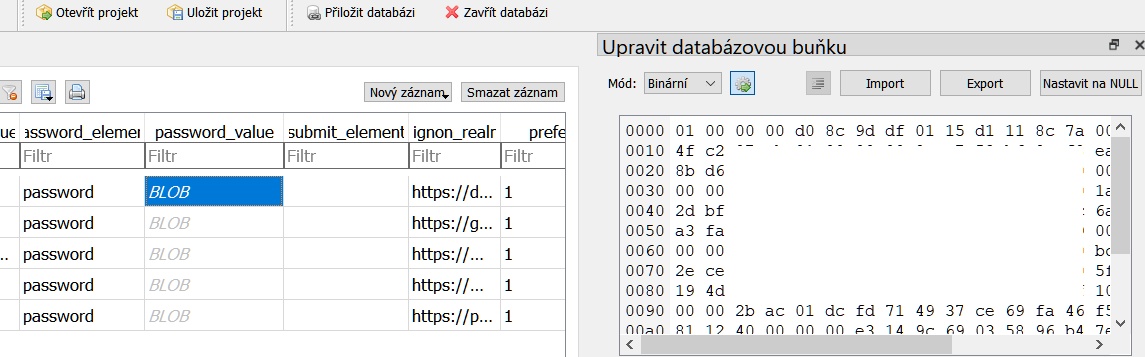 Důležitý je sloupec "password_value" - označený jako BLOB. Na to když klikneš, uvidíš v tom pravém o…