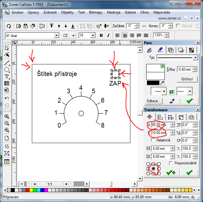 Takže na plochu o konkrétních rozměrech chci umístit popisky, pokud možno i v rámečcích, na konkrétní místa. Takže potřebuju, aby ty pozice popisků bylo možno v tom programu přesně umístit/zaměřit, aby to sedělo vůči fyzické pozici na zařízení.