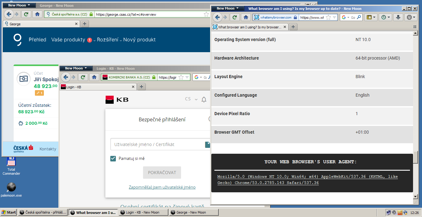 Naštěstí pro Windows XP i Vista existují stále technologicky i po stránce bezpečnosti záplatované, aktuální prohlížeče s aktuálními root certifikáty, html5, TLS1.2 a vším potřebným. NewMoon / Mypal (od různých vývojářů, forky PaleMoonu, který zase vzešel z Firefoxu), lze mít i češtinu. Aby stránky banky neřvaly, tak doinstalovat rozšíření, které změní useragent, takže se prohlížeč hlásí třeba jako Chrome na Windows 10. Třeba "Eclipsed Moon."