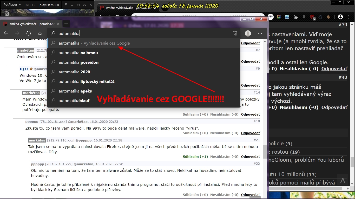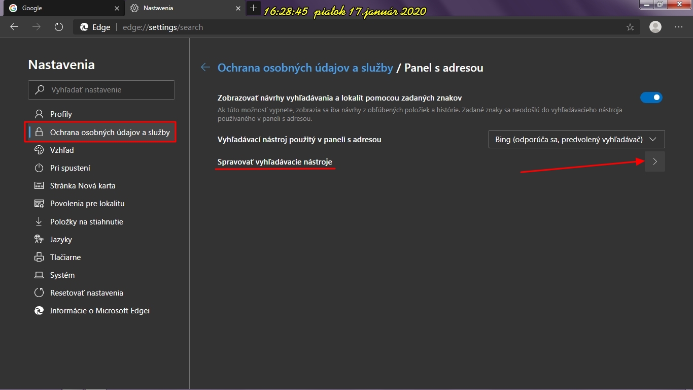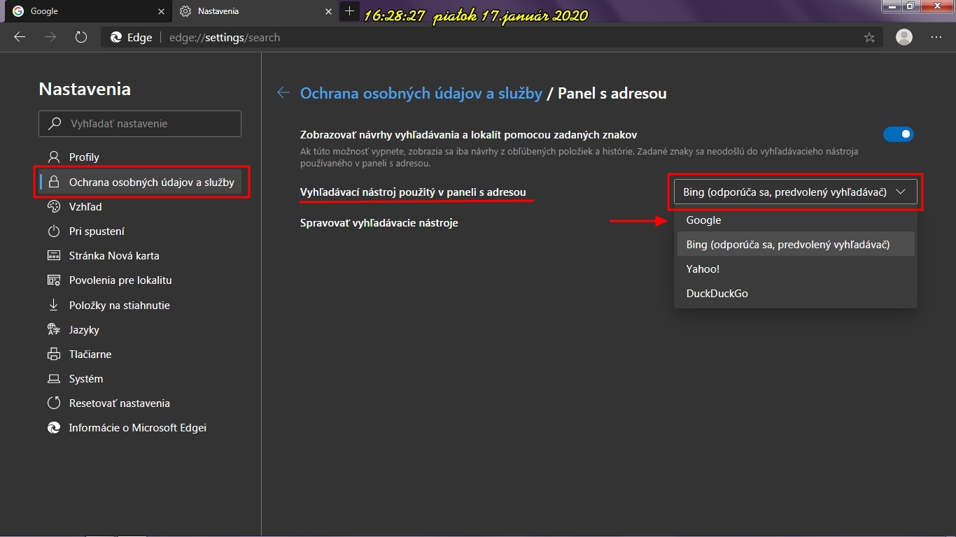 Prohlížeč je Edge - chce vyhledávač Google, jenže tam naskočí Bing. Už jsem psal, jak jsem to nastav…