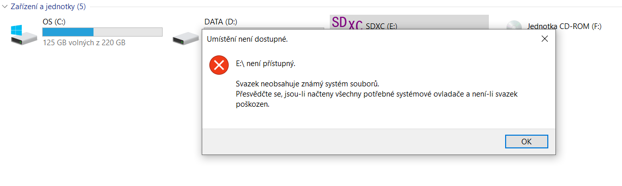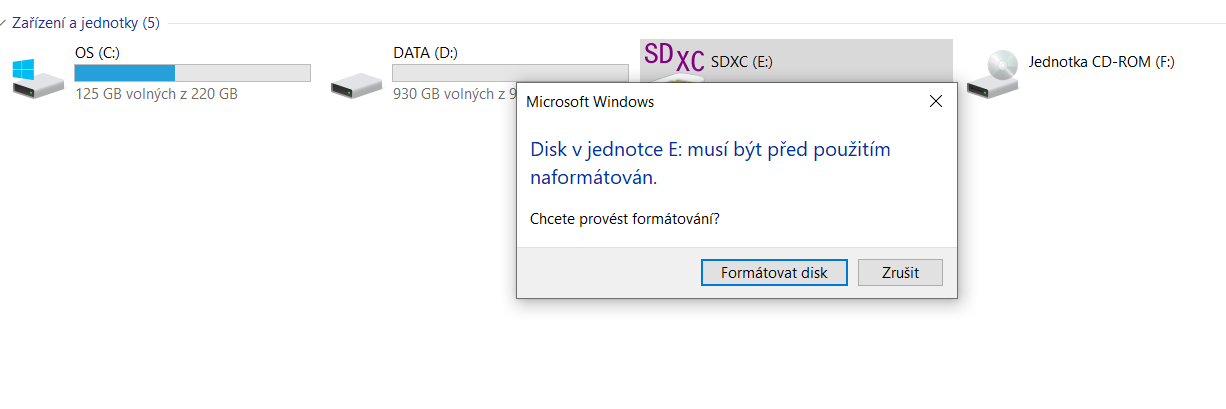 Ano, kartu mám v PC normálně detekovanou ale vyskočí hláška s tím formátem a potom, že neobsahuje známy systém souborů.
