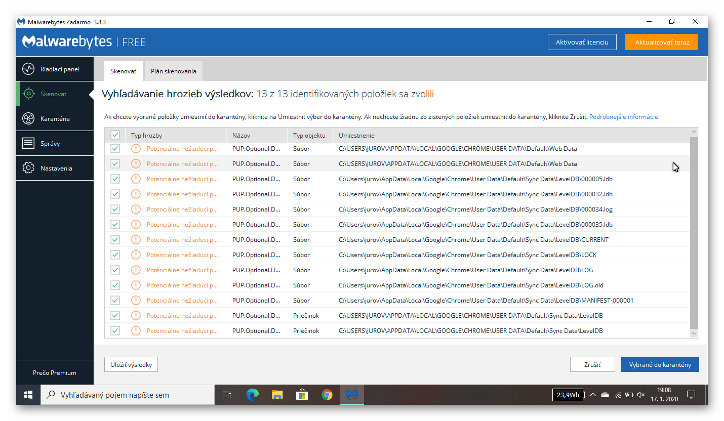 Dobrý večer,možno to bude vypadať,že nemám čo robiť,len vyhľadávať vírusy na svojom notebooku.Mam notebooku Lenovo G 500,Win.10 home verzia 1909.Antivirák defender+malwarebytesfree.No a malwarebytesfree mi aj 2 krát do týždňa nájde tie isté výrusy.Po preskenovaní ich dám do karantény,a všetko ok.No ale potom keď znova preskenujem notebook príklad vo štrtok,ked som predtým skenoval v pondelok ten istý týždeň,vírusi sa znova.Objavia.Myslím si že nejde o vírusy ale o Potencialne nežiadúci program asi.vid foto.Pekný večer