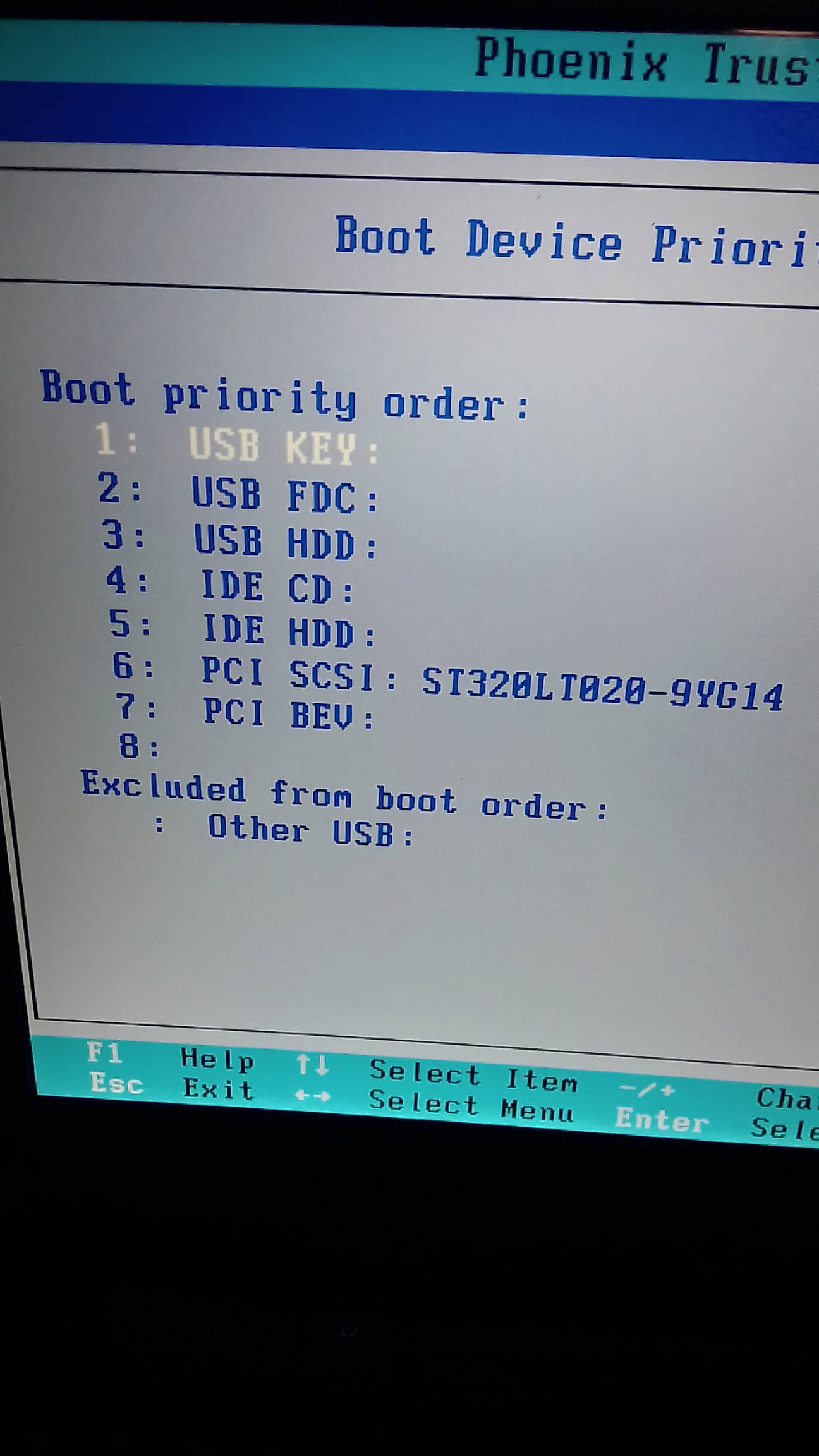- buď jít dolů na "excluded from boot order" a přesunout "other usb" na první místo do horního seznamu pomocí +- šipek a enter, tvůj klasický sata disk ("scsi") pak za to.