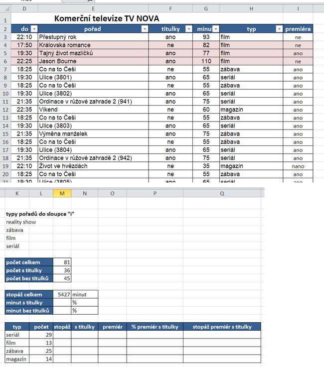 Potřebuji z toho vytáhnout do tabulky, která je na jiném listě sešitu stopáž pouze premiér s titulky u seriálů (zbytek si odvodím). Těšil jsem se, že mi bude fungtovat něco takového a marně.