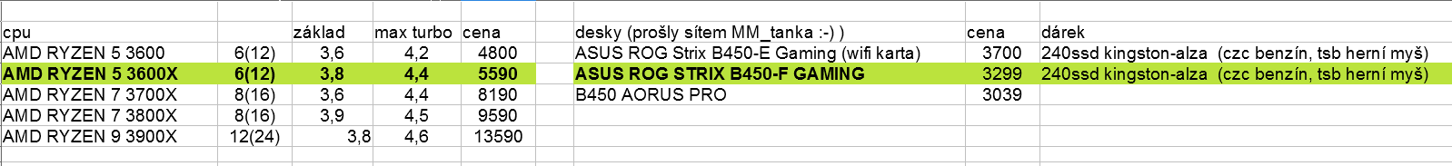 Uvažoval sem Gigabyte B450 AORUS PRO za nějaké 3039 a potom ty dva asusy. Dárek 240GB SSD v podobě kingstonu rozhodl.