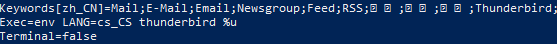 Na tom obrázku co jsi postnul, aby jsi našel "Exec=thunderbird %u" ktery máš popřípadě upřesnit na "Exec=env LANG=cs_CS thunderbird %u" , musíš sjet trochu níž.