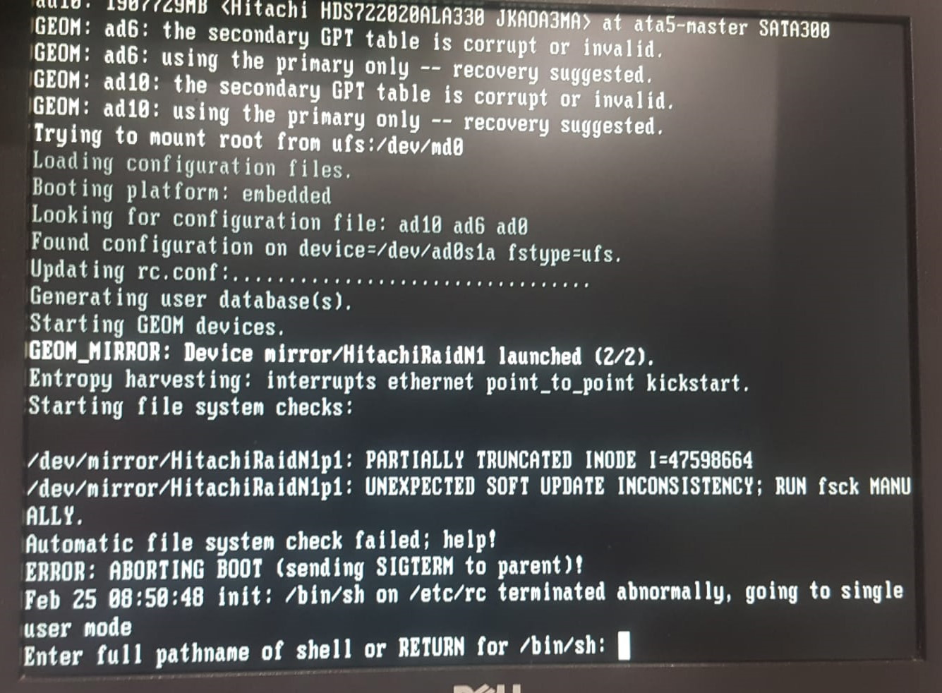 1. enter (dostaneš se do shellu) 2. fsck -y /dev/mirror/HitachiRaidN1p1