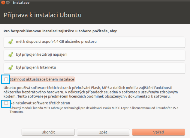 - Při instalaci té LTS (18.0.4*) nech zapojeny internetový kabel (LAN) a označ tyto uvedené dvě položky :