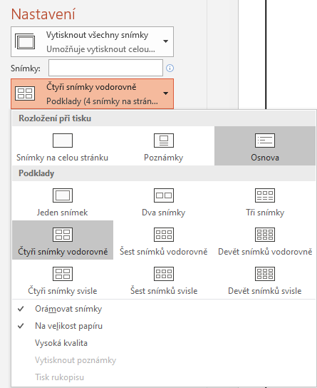 Při tisku potřebuji dostat 4 slide na jednu A4 + kolem kolem strany vložit rámeček s hlavičkou.