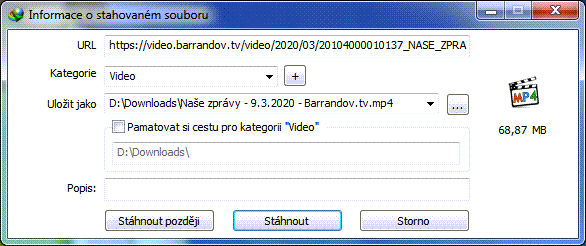 Dobrý den. Potřebuji stáhnout jedno video z Barandova kde vystupuje moje vnučka. Musel jsem zaplatit předplatné na týden, abych se na něj mohl vůbec podívat. Video funguje, ale já ho potřebuju nějak stáhnout a uložit v PC. Jak to mám udělat? Děkuji za radu. :beer::beer::beer: