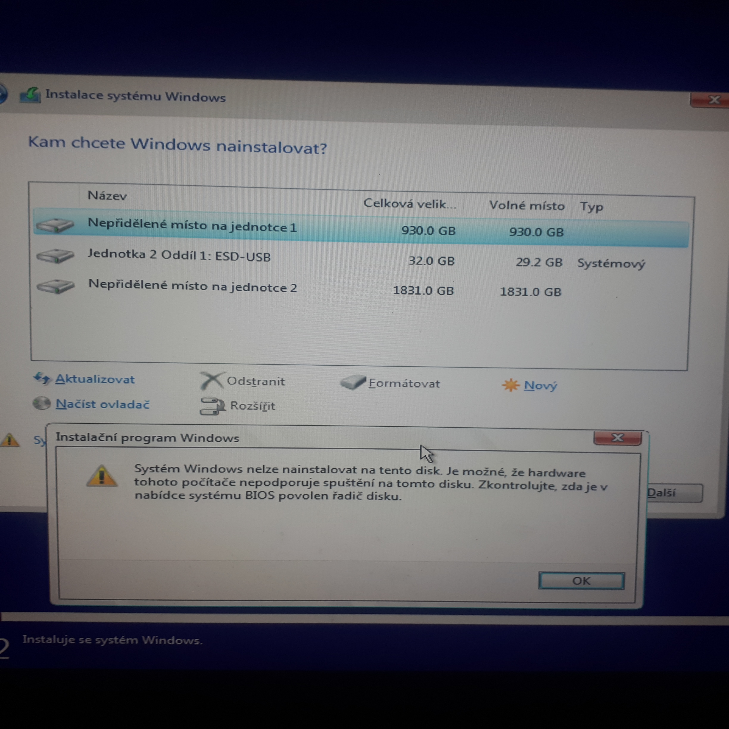 Systém windows nelze nainstalovat / Nelze nainstalovat na tento disk