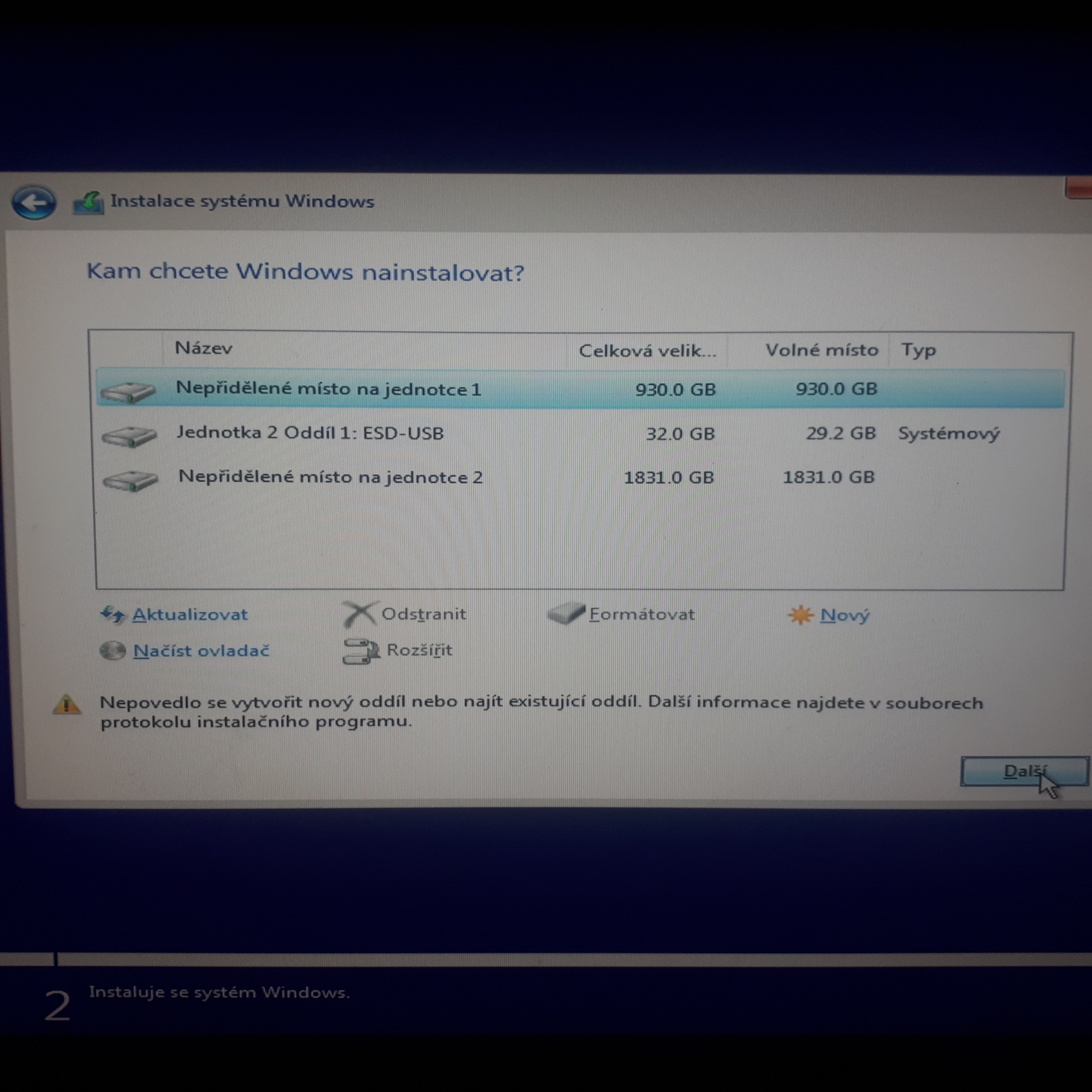 Teda jen další hláška... Nepovedlo vytvořit nebo najít oddíl...