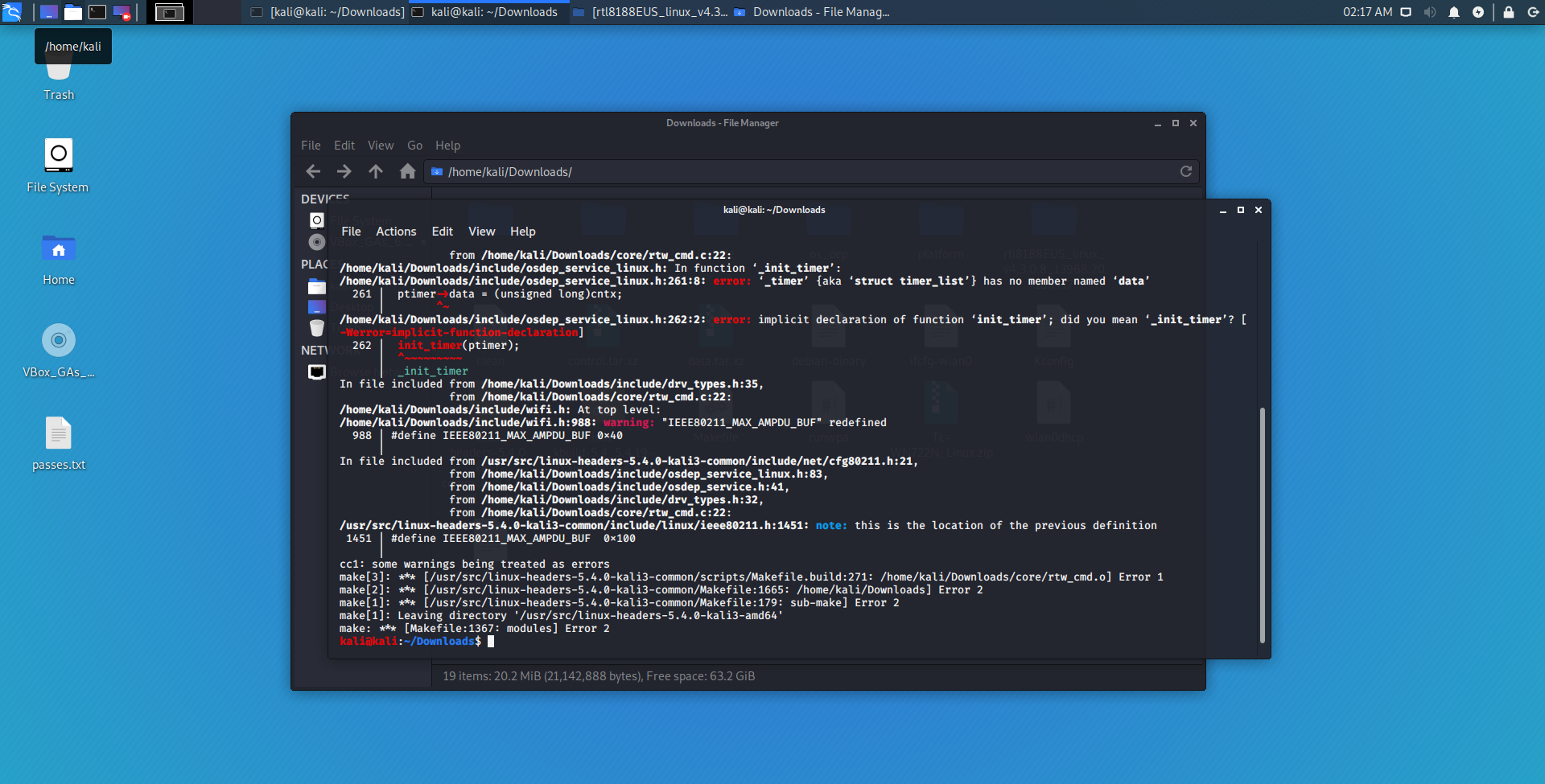 Takže teraz čo musím spraviť, je na kali linux nainštalovať ovládač pre môj wi-fi USB adaptér. Ale tu nastáva ďalší problém... AKO. Pretože keď v zložke, kde je stiahnutý driver, napíšem "make", tak to síce začne dačo "načítavať", ale skončí to chybovou hláškou.