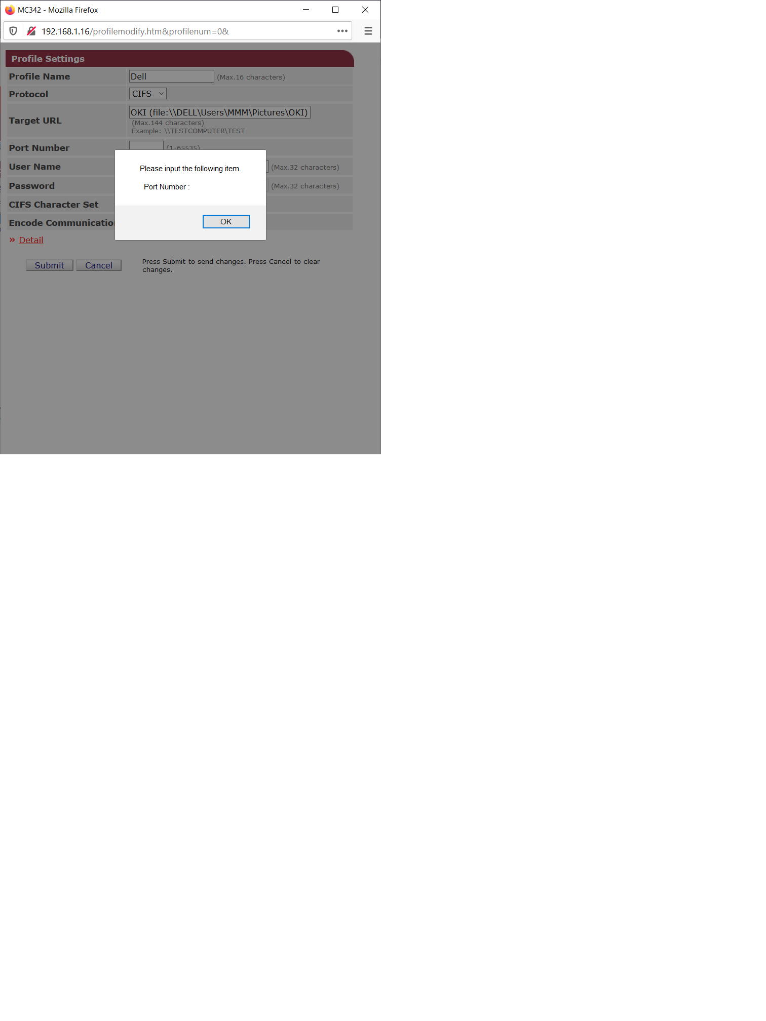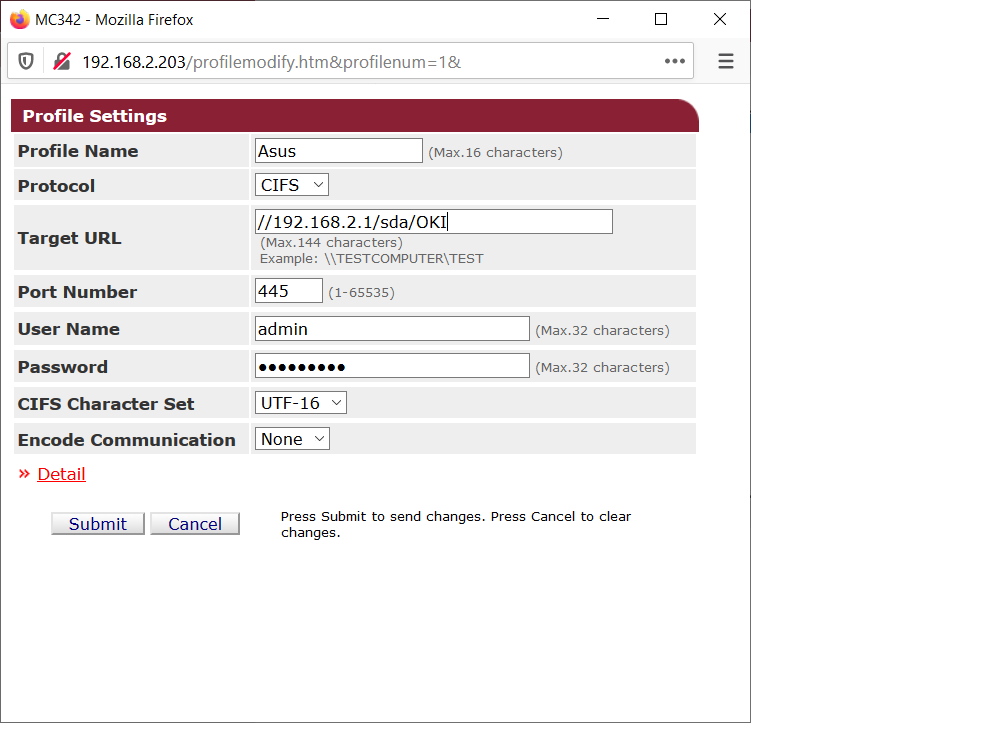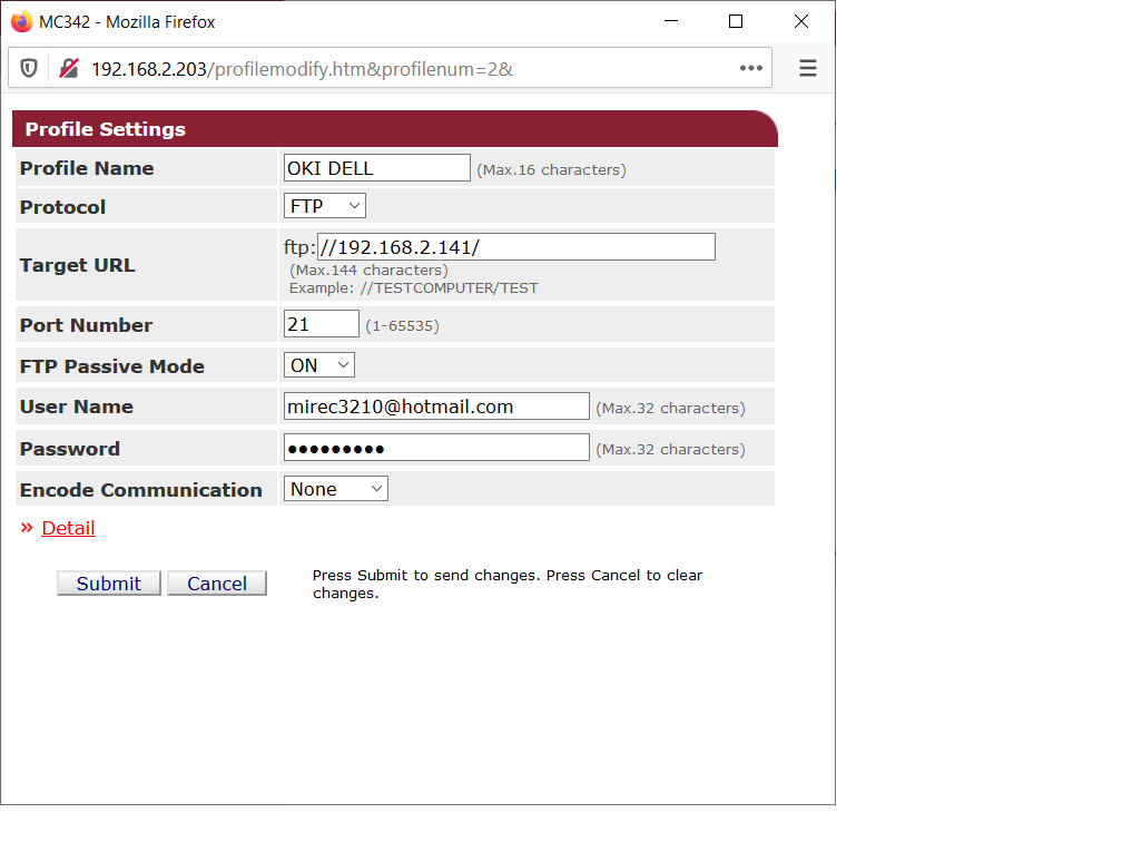 Do tiskarne jsem pomoci web rozhrani vytvoril novej Profil kde jsem zadal URL ftp://192.168.x.x/sda/OKI(ale nejde to ani s ftp://192.168.x.x,heslo a jmeno routru a PORT jsem dal 8080..