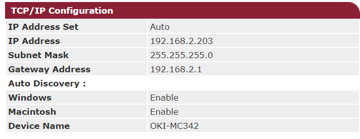 v tom nastavení je vidět i hostname "mc342", kdybys ho potřeboval pro nastavení portu tiskárny v ovladači místo její ip. právě router by ten hostname mohl vidět.