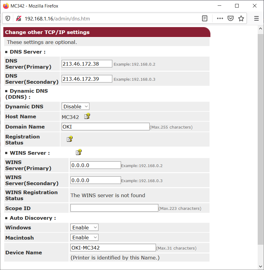kontrolní otázka: myslíš, že dns 213.46.17.38 zná jméno tvé oki tiskárny a umí ji přeložit na tvou lokální ip adresu?