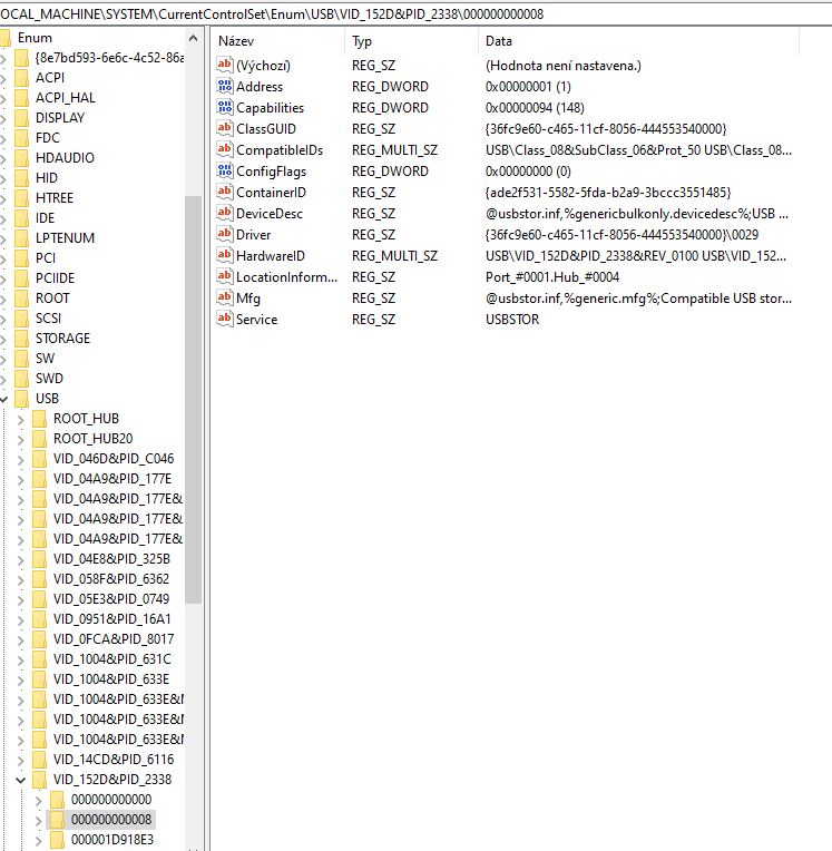 (jinak je v HKEY_LOCAL_MACHINE\SYSTEM\CurrentControlSet\Enum\USBSTOR)