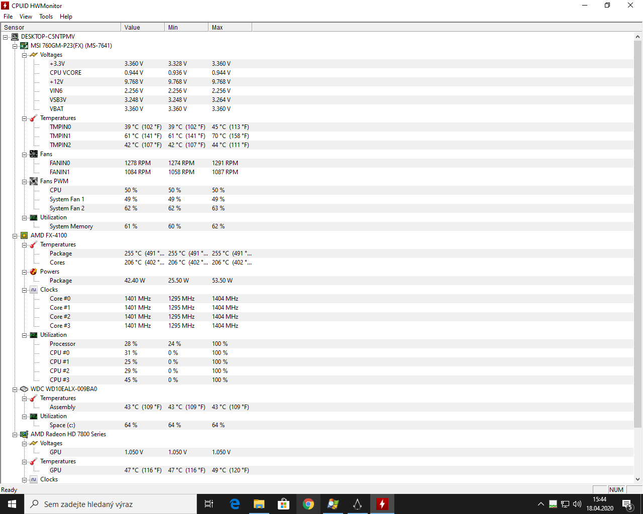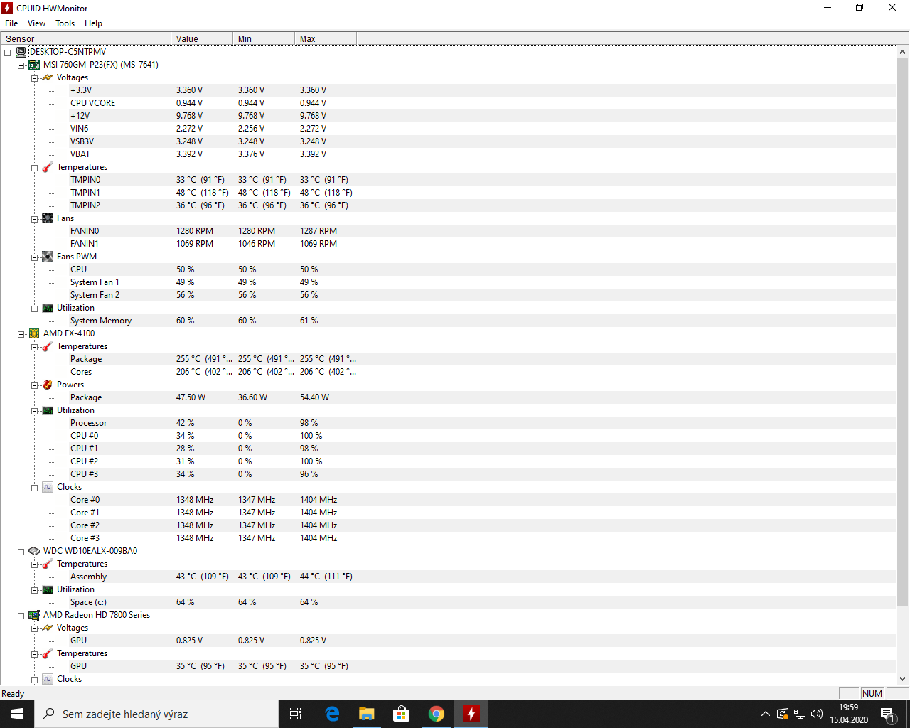 Můj počítač vždy po cca 1,5 hodině hraní tak nějak rezignuje a hra, která byla v pořádku hratelná třeba s 50 FPS klesne na 10 a nedá tak dál hrát. Můj počítač je i celkově o dost pomalejší a musím ho vypnout a chvilku nechat, aby se zas vrátil do původního stavu. Pode HW Monitoru je asi problém u CPU - teploty při tom stavu dosahují 255 stupňů, což podle mě nemůže být pravda, protože by se procesor uškvařil. Prosím Vás o radu, děkuji a přikládám screen.
