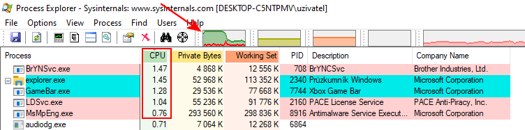 tebe zajímá vytížení cpu v zátěži = nechat ten process explorer běžet na pozadí, v systray vpravo dole bude ukazovat ikonu s grafem. až při větší zátěži zkontrolovat, který proces obtěžuje cpu.