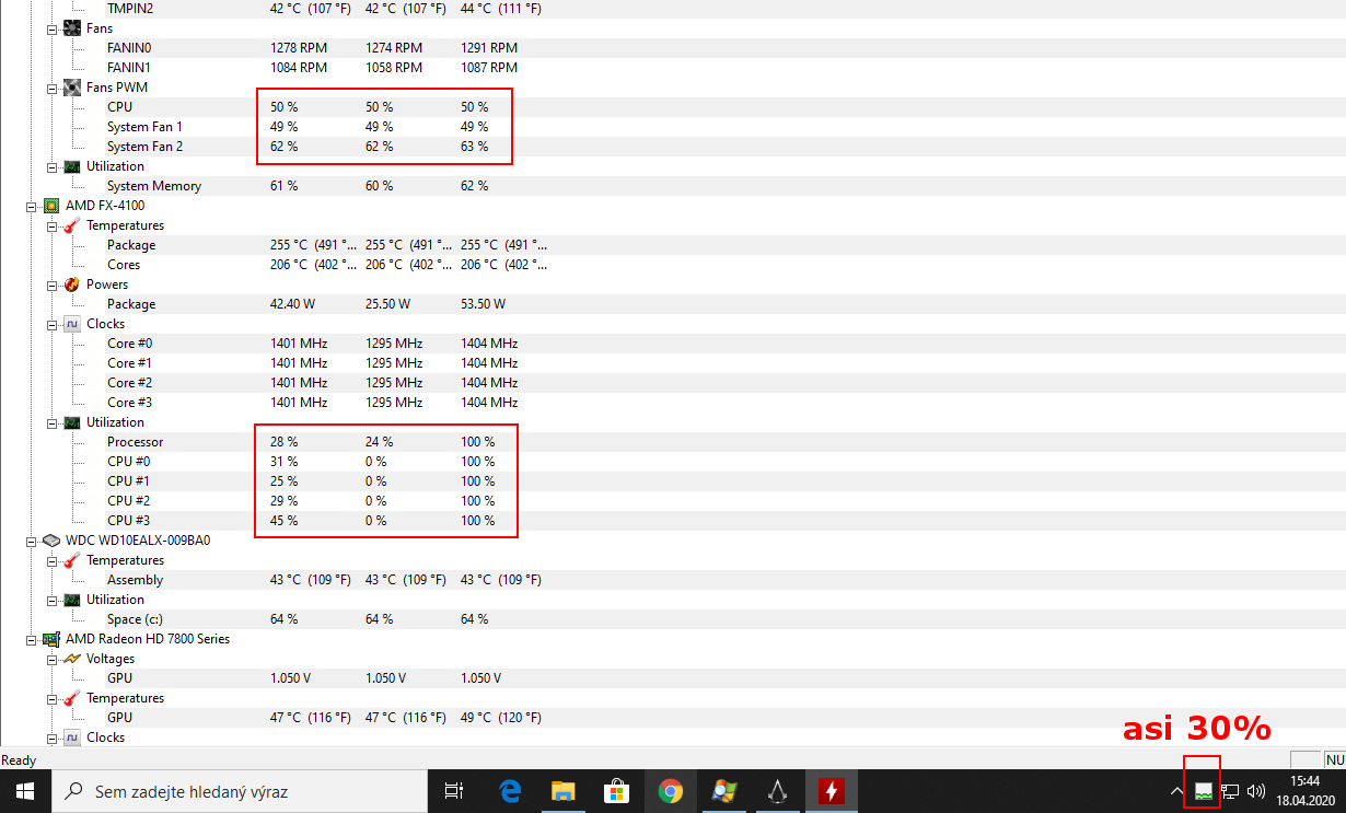 ať máš vytížení 30 nebo 100%, větráky se točí pořád stejně, cca na 50%.
