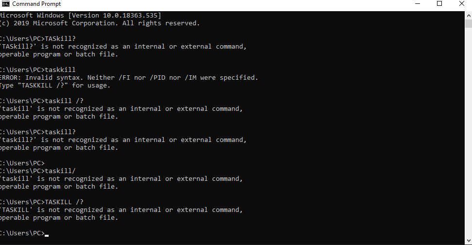 Zkus místo TASKILL napsat TASKKILL /? s dvěma "K".