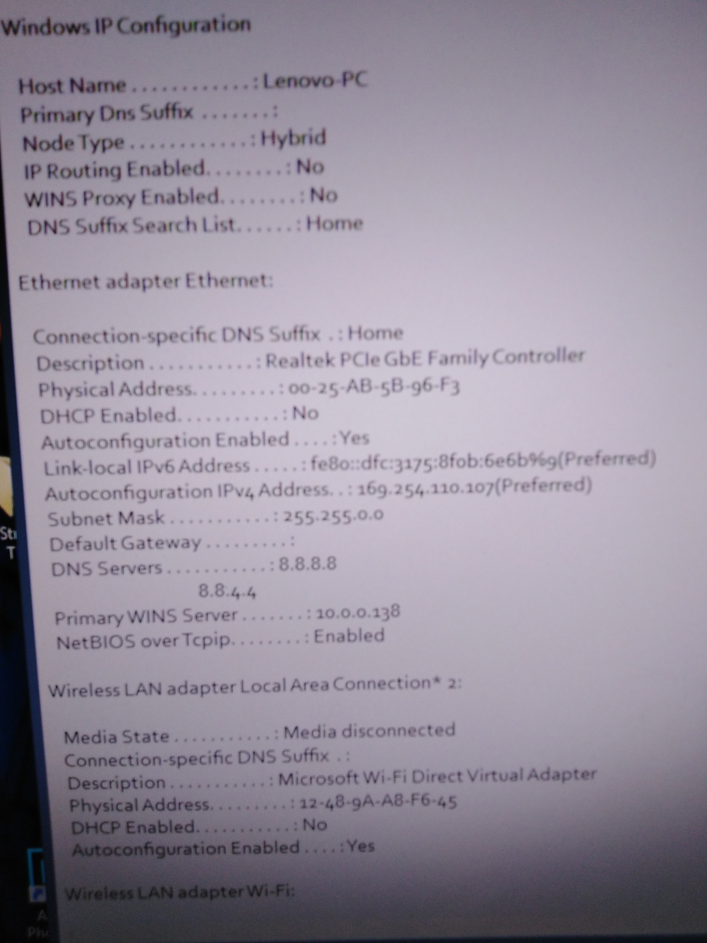 dhcp enabled ... no ... proč, když to neumíš staticky nastavit?? ip ... 169.254.x.x ... nedostal jsi kdysi adresu z dhcp, windows si po vypršení času nastavil náhodnou ip z tohoto rozsahu. teď ručně nastavuješ stejný nesmysl. zapomeň na to. gateway ... nic ... tu měla být ip routeru. primary wins server ... 10.0.0.138 ... třeba, ale k čemu ti je wins? toto je typická ip adsl-routerů, čili pc má dostat adresu: 10.0.0.x a správnou masku.