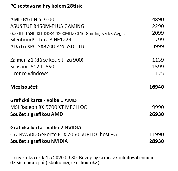 Bohužel kvuli cene jsou potreba kompromisy. Ja bych zvolil procesor 3600 pod ten bych nesel, jiny chladic, rychle 1tb ssd plus 2az4tb klasika, levnejsi grafika bohužel {nebo pridej aspon 150e na to co pisu plus 2060 super} a obycejny nepruhledny case.