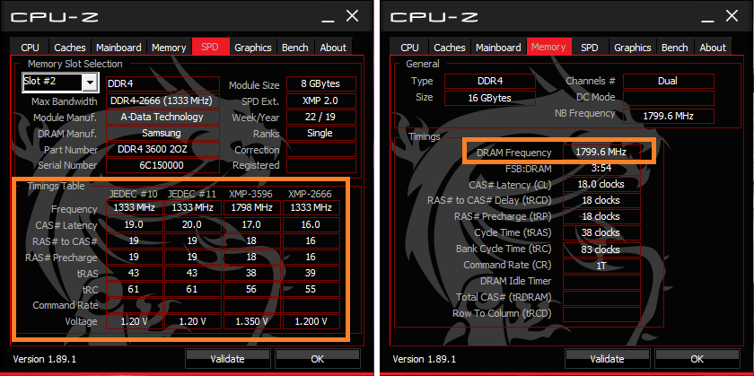 velký oranžový rámeček v záložce "SPD" ti přehledně ukazuje všechny rychlosti a časování, které modul podporuje. V malém (záložka "Memory") je pak vidět, na jaké frekvenci to pak reálně běží - vidíš, že mi to jede jako DDR4-3600.