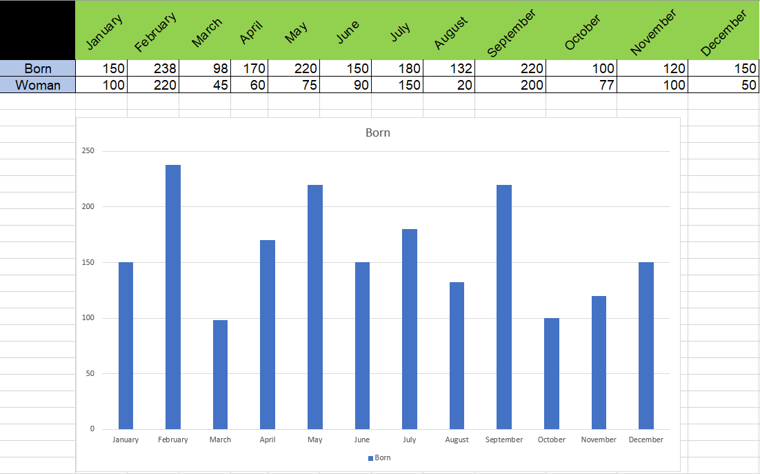 Konkrétně, August má nejnižší hodnotu, proto bude barva velmi světle modrá. A s každou vyšší hodnotou se saturace bude zvyšovat až k February, které má největší hodnotu a proto bude barva velmi tmavě modrá.