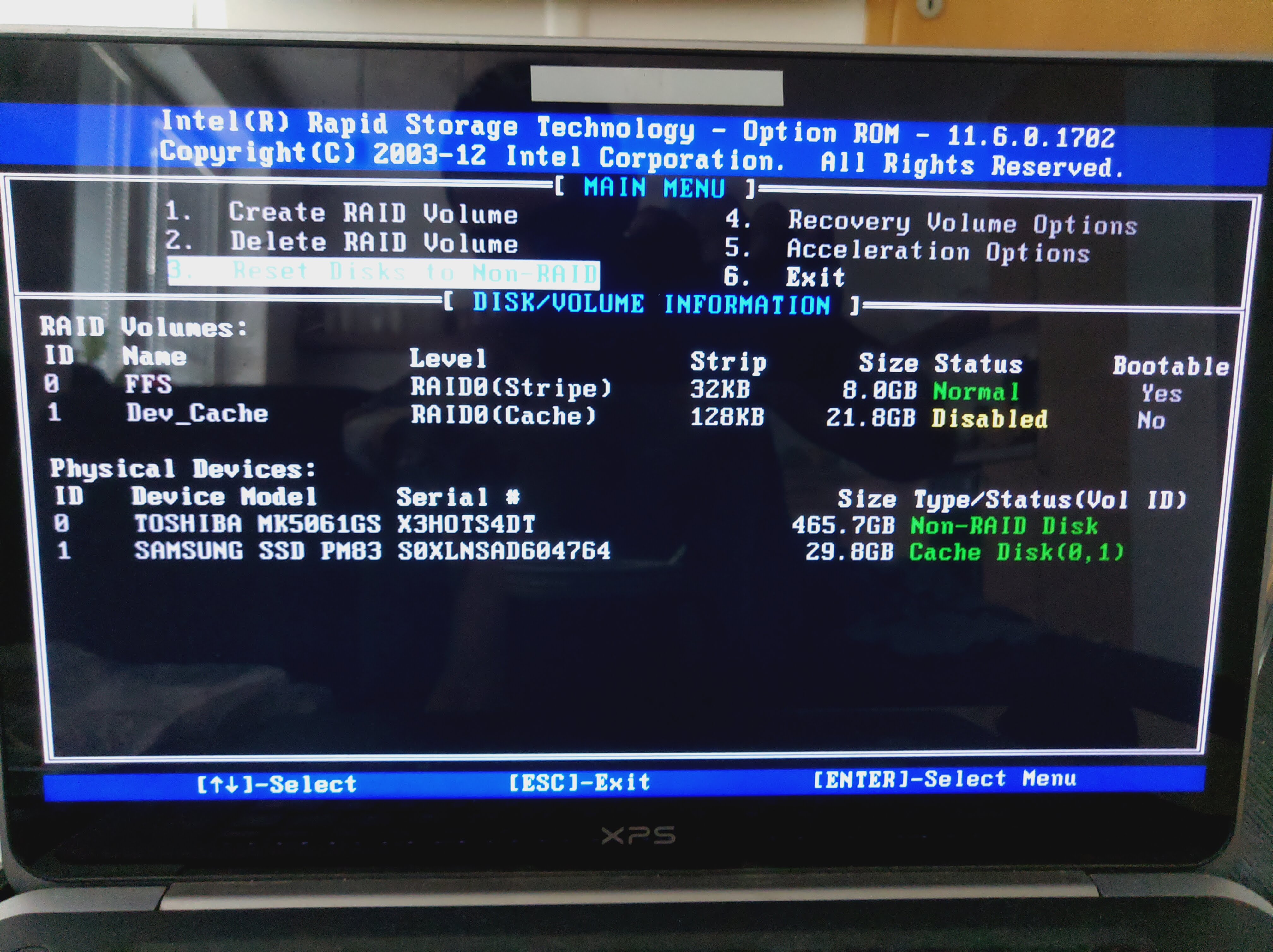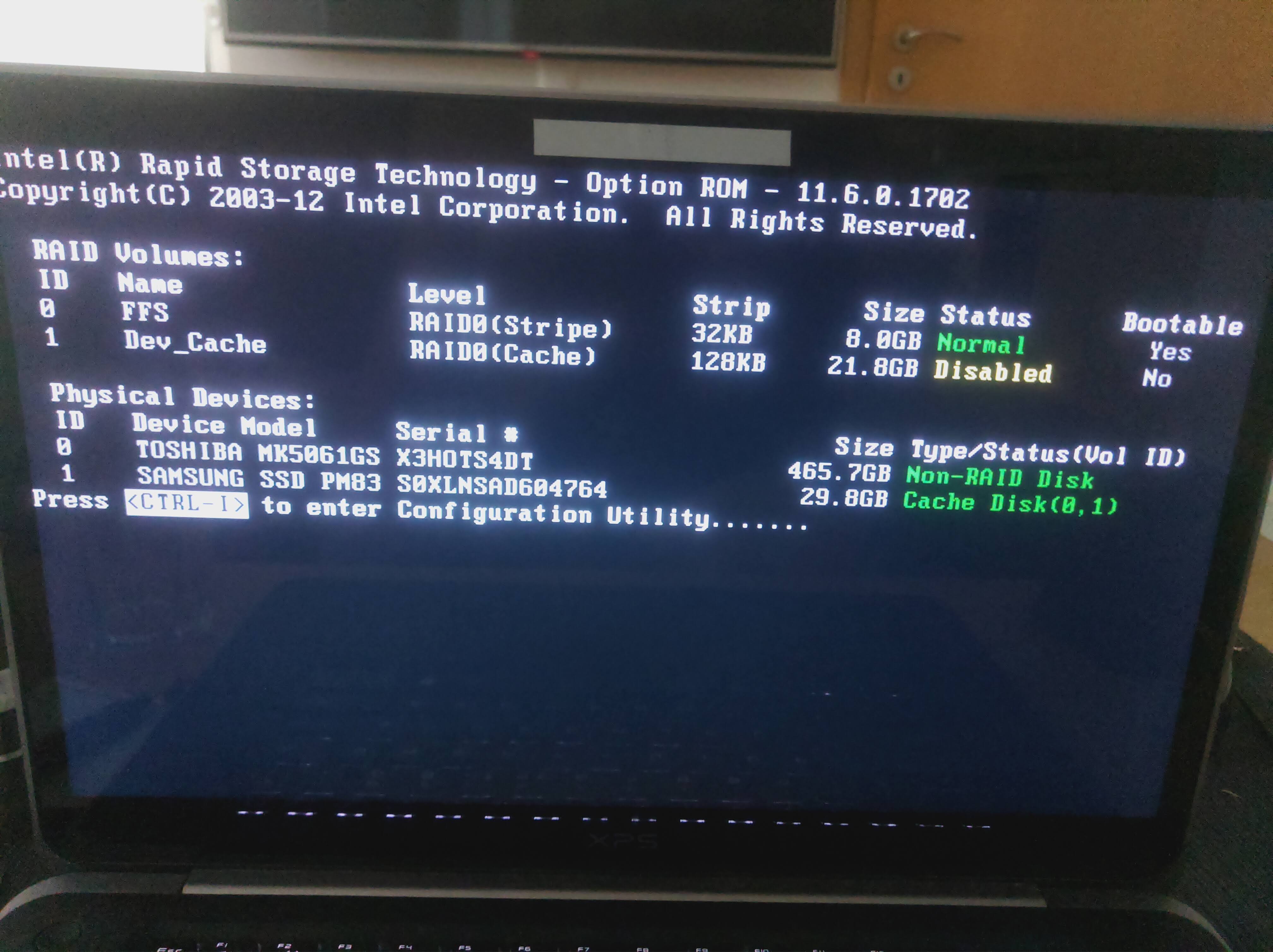 Pokud je SSD disk vymazán a pouze inicializován (bez pártyšny), tak lze normálně nabootovat v režimu RAID z 500 GB HDD.