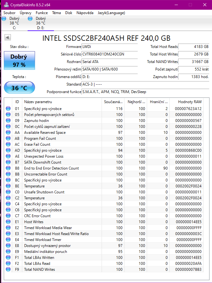 Konkrétní název z CrystalDiskInfo: intel ssdsc2bf240a5h 240GB. Více informací na fotkách. (nevyznám se v těch hodnotách)