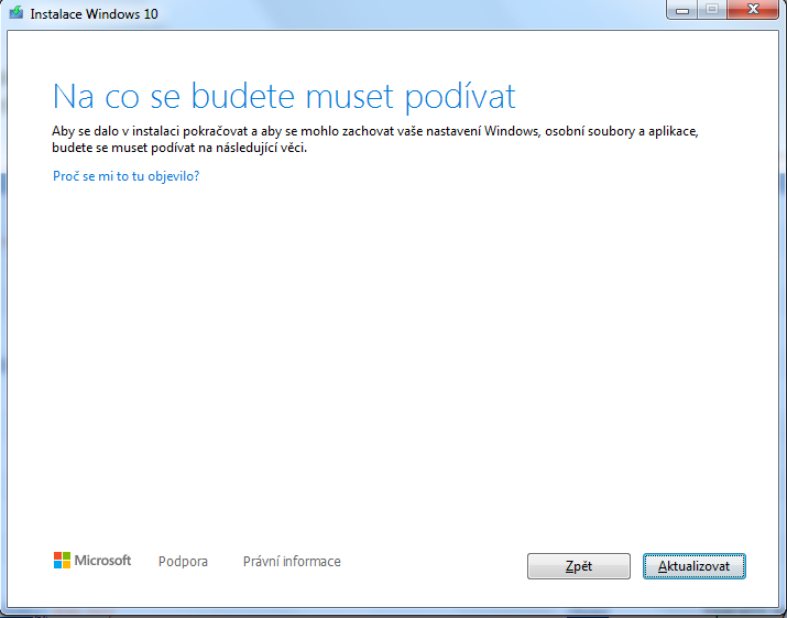 Chci updatovat Windows 7 na Windows 10, tak jsem si stáhl updatovací soubor z Microsoft stránky, který mi stáhl vše potřebné pro update. Jeden krok před instalací updatu jsem ale dostal zprávu viz příloha. Když kliknu na "Proč se mi to tu objevilo?" dostanu se na https://support.microsoft.com/en-sg/help/4457662/windows-10-what-needs-your-attention-notification
