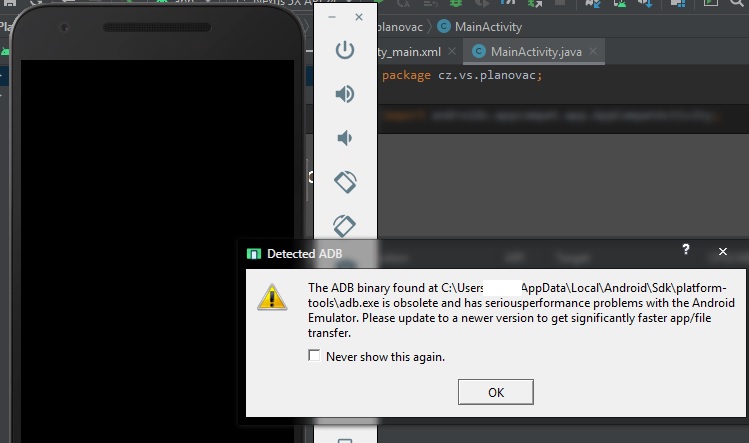 The ADB binary found at C:\Users\uživatel\AppData\Local\Android\Sdk adb.exe is obsolete and has seriousperformance problemss with the android emulator.Please update to a newer version to get significantly faster app/file transfer. díky