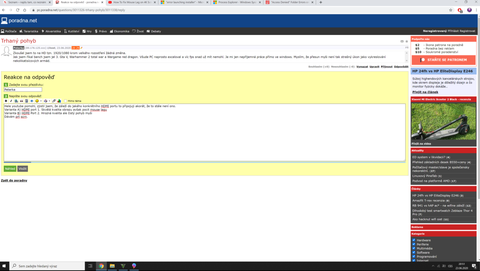 Porovnávám to se svým notebookem, macbookem a obecně počítači se kterými pracuji. (Poprvé používám 4k monitor). Momentálně jen základní ovladače. Vzhledem k velikosti aplikací na ploše používám přiblížení ve windows na 150%. Při pohybu po windows atd. mám pocit zasekávaného pohybu, jakoby trvala doba mezi předání informace z myši do Pc více MS než je běžné. Není to takový čistý pohyb. Ve hře jako např. GTA V všechn naprosto čisté a max fps, ale mám takový nepříjemný pocit z když pracuji přímo ve windows. Nevíte čím bych mohl začít diagnostiku ? Update byl proveden. Mohlo by to být způsobeno přímo monitorem ? HD monitory jsou přeci jenom rychlejší než ty 4k.