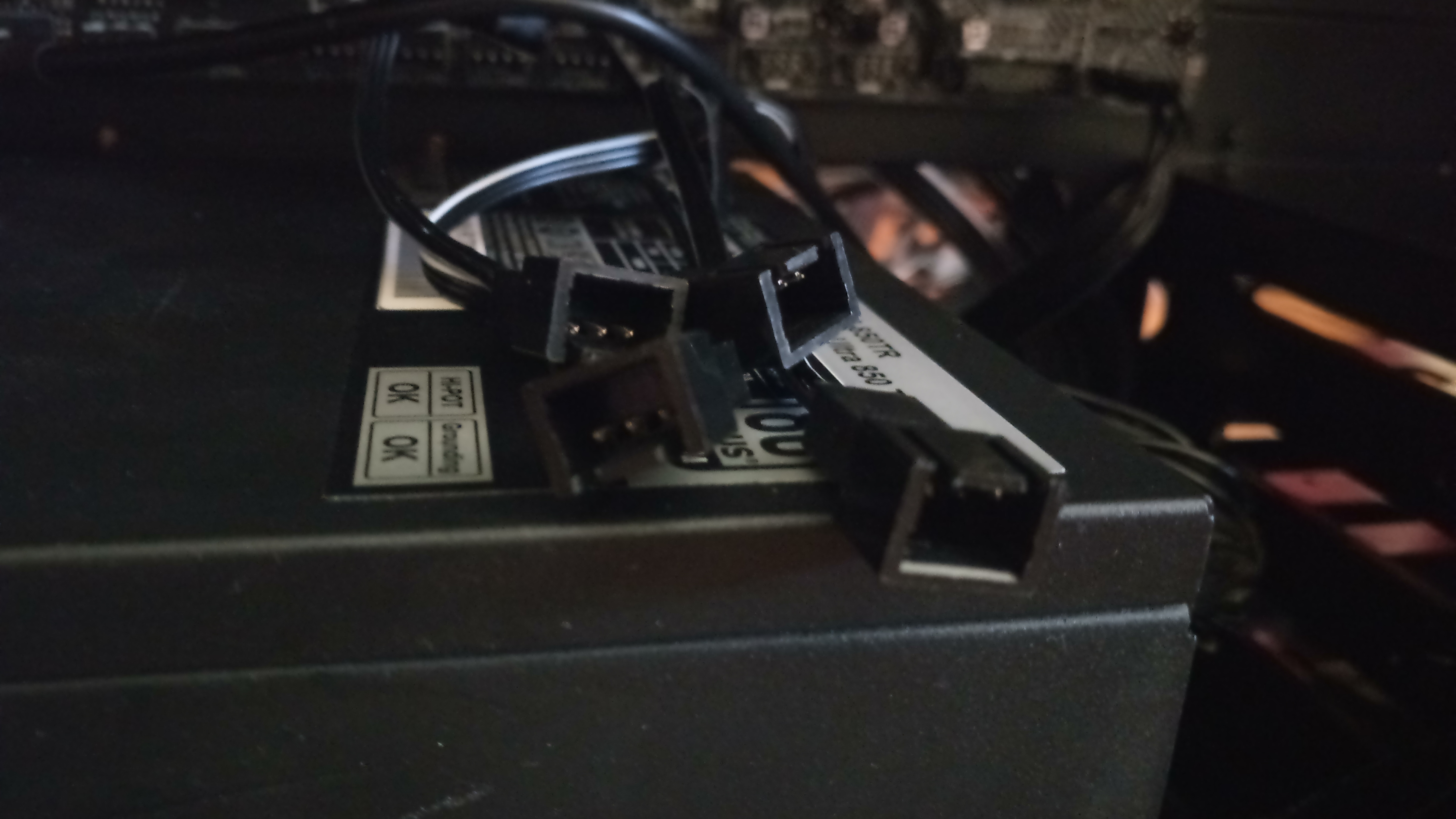 Na foto1 jsou konektory vedoucí z regulátoru otáček (na skříni) který by se měl molexem připojit na zdroj.