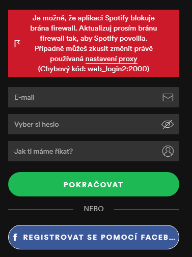 Mám takovou otázku ohledně spotify používám ho už nějakou dobu a z ničeho nic mi na pc zmizelo v oblíbených všechny písničky. Ale na mobilu to funguje tak jsem si řekl, že si zkusím založit nový účet, jestli nemám jen něco zle ponastavené. No, chtěl jsem si ho založit přes fb ale furt mi vyskakuji takové errory zkoušel jsem firrewall i vypnout všechno možný, ale pořád to nefunguje. Nebyl by tu někdo schopný mi poradit co s tím? Všechny errory a chyby zasílám pomoci obrázku.