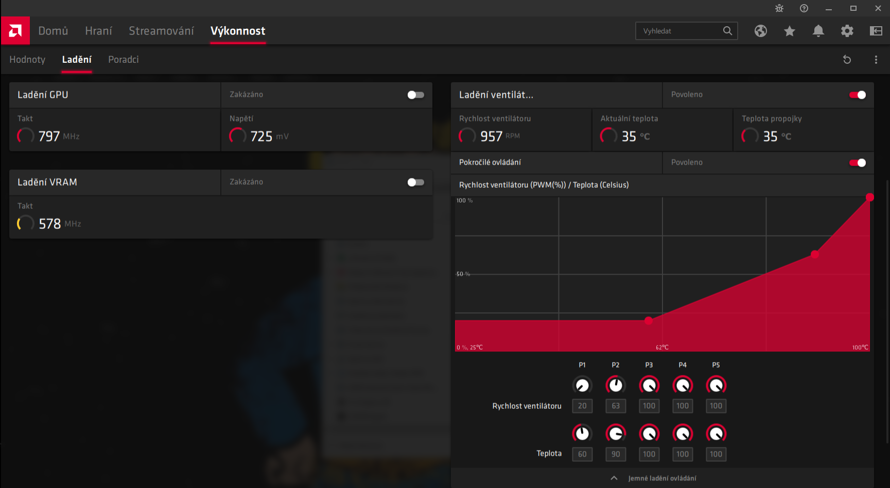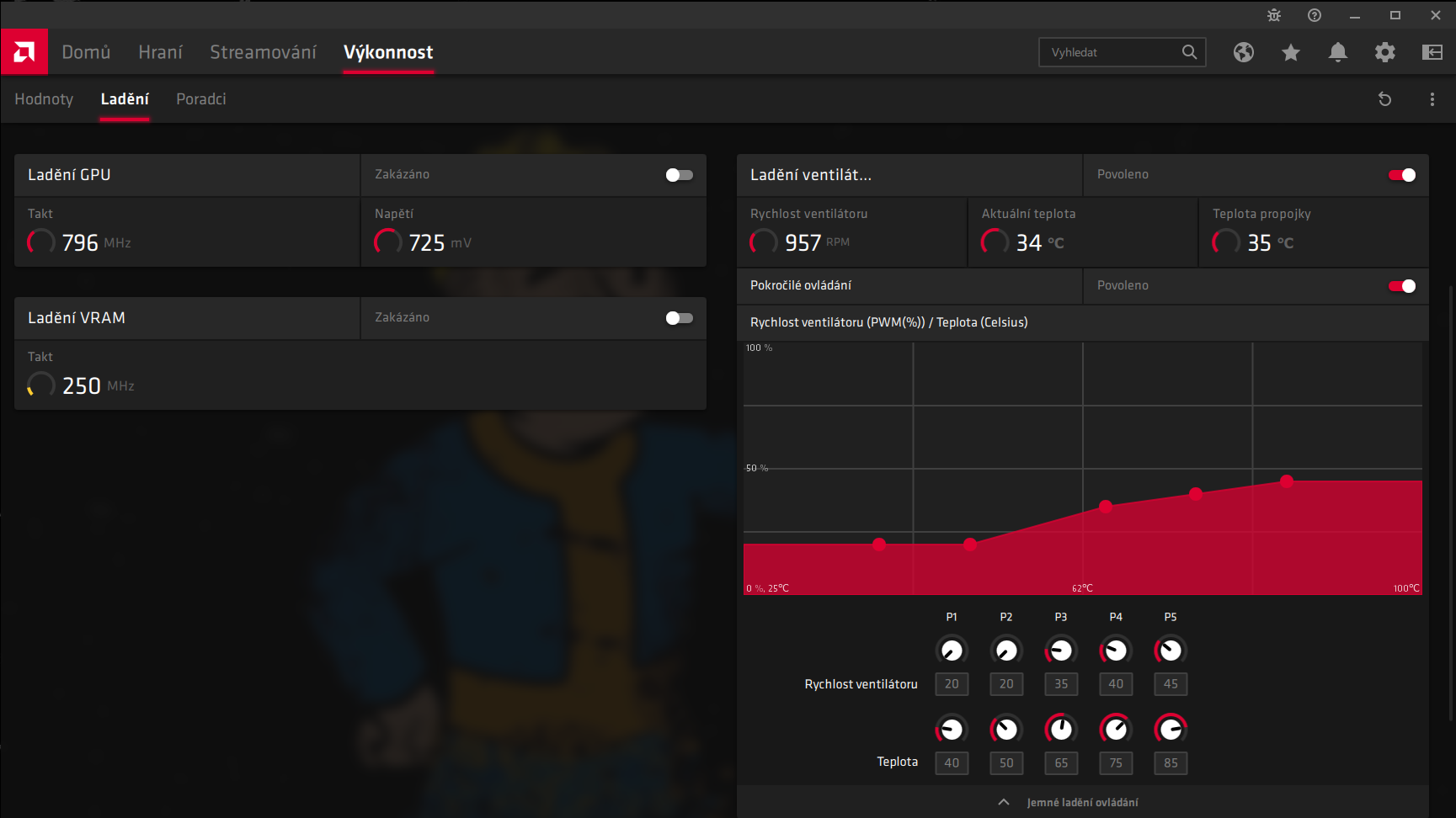 Zdravim, Moc vás všechny prosim o pomoc neustále se mi mění nastavení rychlosti větráků...začalo to nedavno a nevím si stim rady.., jsem stoho dost vystrašenej, grafiku mám novou tak půl roku.. Hrál jsem a najednou začnou fany na grafice řvát na 100% klesá to a přidává a takhle pořád dokola..Jdu tedy do nastavení větráků které mám ruční a normálně mám nastaveno takto HrgLWS8 ale neustále se mi to mění na tenhle nesmysl!!! C2X5bgv je tam třikrát stovka u posledních teplot! stovka třikrát po sobě která tam ani nejde napsat.. teplotu jde přidávat jen po pěti..teplota se pohybuje okolo 60-70 stupnů. Fany hučí dokud si to nezměnim zpátky na svoje hodnoty nebo nedám tovární nastavení..myslel sem si že je softwarová chyba v ručním nastavení fanů oto divnější je že jsem tedy zkusil dát nastavení rychlosti větráků automaticky a myslel si že tim to vyrešim ale děje se to dál hučí hučí a když to přenu na ruční zase už sou tam přednastavený ty nesmyslný tři stovky. Vím jistě že to nedělají hry samo od sebe se to vždy přehodí na ty divný hodnoty a grafika jakmile zabare v jakékoliv hře tak si myslí že má jet na 100% dokud jsem na ploše drží se to na těch prvních dvouch teplotách.