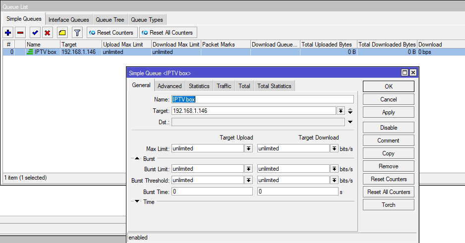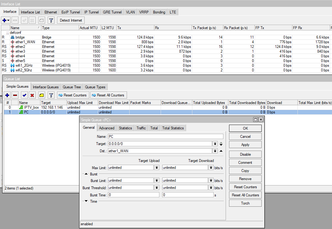 Děkuji za odpověď. Zkusil jsem změnit unlimited a "něco" to začalo počítat. Ale hodnoty jsou to podivné. Zkusil jsem vynulovat počítadlo a stáhnout soubor o velikosti cca 7,3 GB. No a Mikrotik mi ukázal: viz obr.