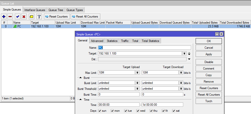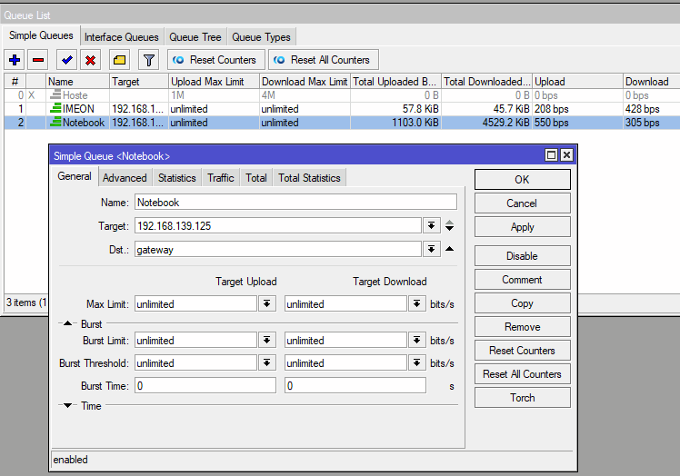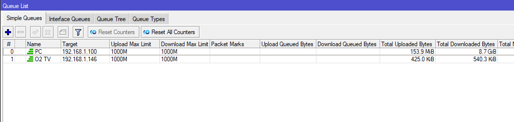 Podle obrázku by to mělo být nastaveno dobře. Teď jsem to zkoušel a po vytvoření simple QUEUE a zadání adresy notebooku to okamžitě začalo v Upload/Drownload zobrazovat aktuální hodnoty.