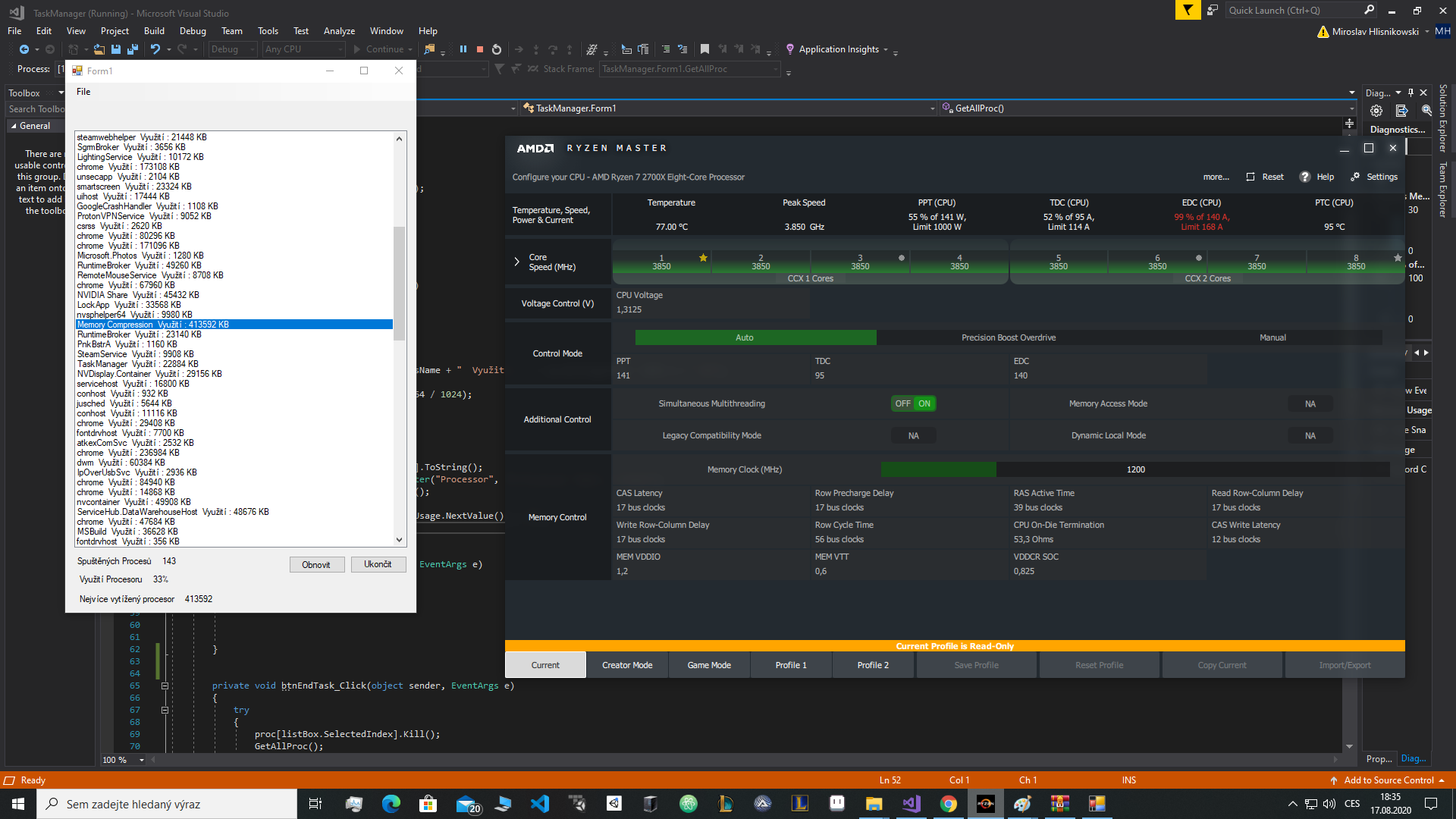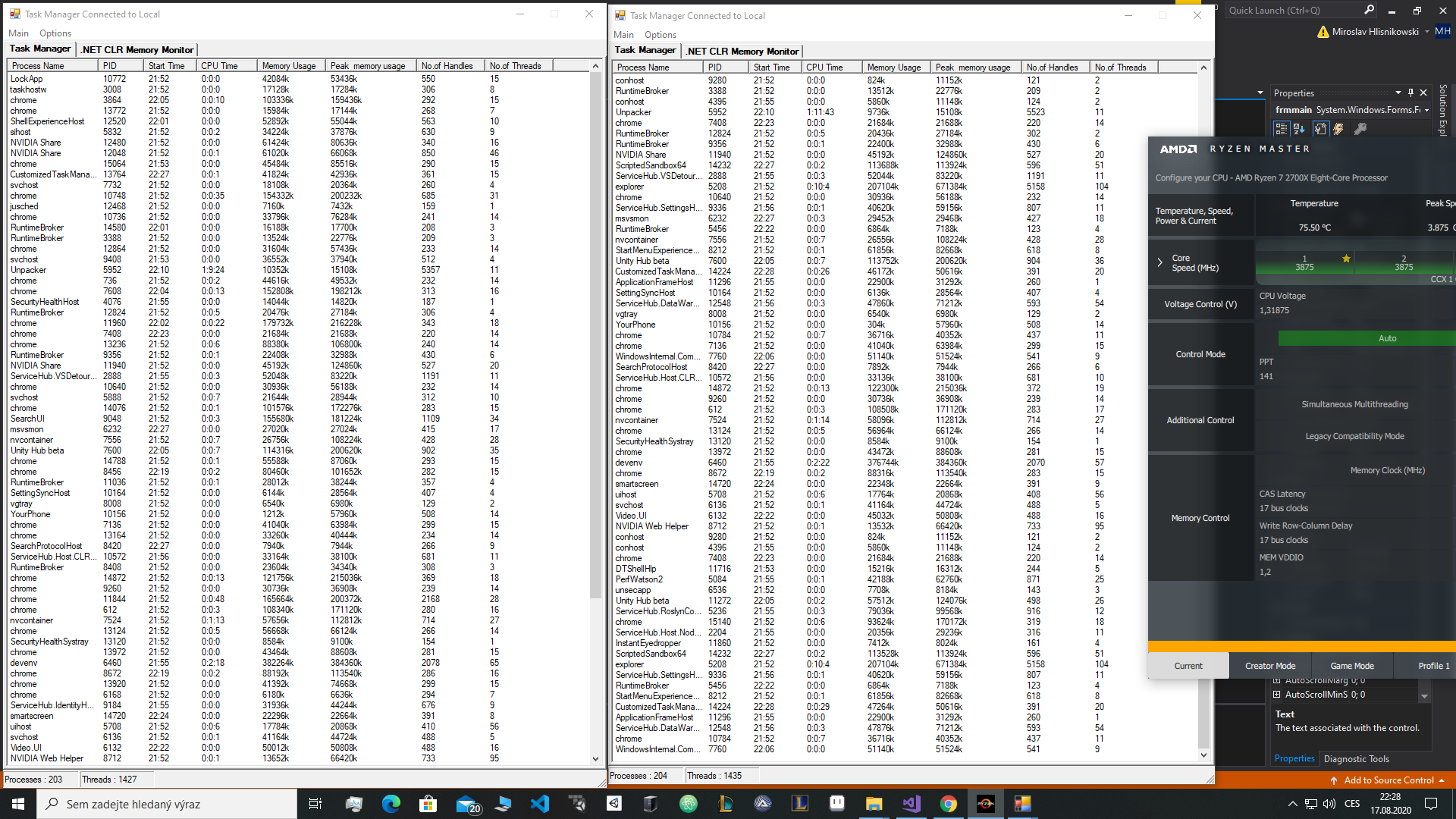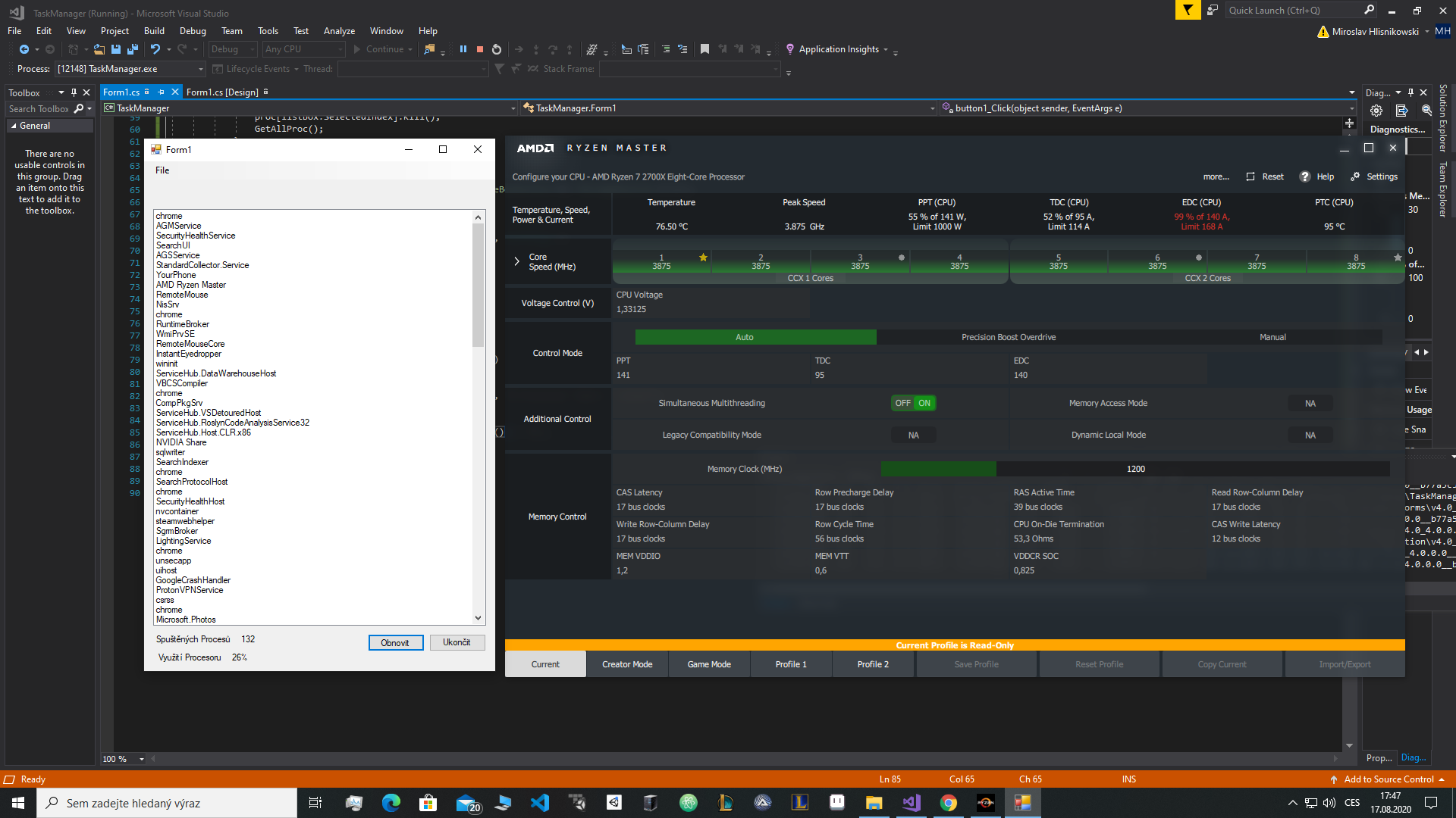 Tak zde jsou vypsané všechny procesy přes C# i s ID a CPU a teplota furt 75.
